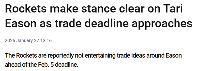 北京时间1月27日,据名记Stein报道,交易截止日来临前,火箭队不考虑任何涉及伊森的交易方案。他们已经回绝所有围绕伊森的交易询价与相关致电。